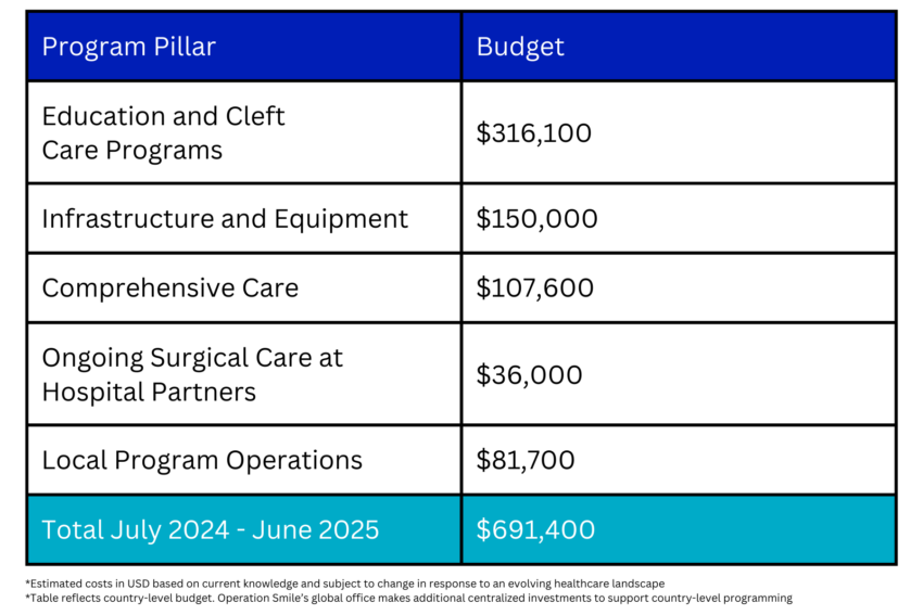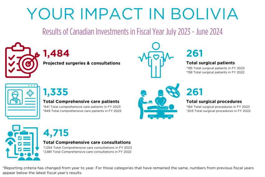 During Fiscal Year July 2024-June 2025, Operation Smile Canada has committed to invest $776,011 CAD, accounting for 67% of Bolivia’s total projected budget for the fiscal year, which will directly contribute to providing high-quality surgery and care for 410 patients and deliver training to 200 medical providers.