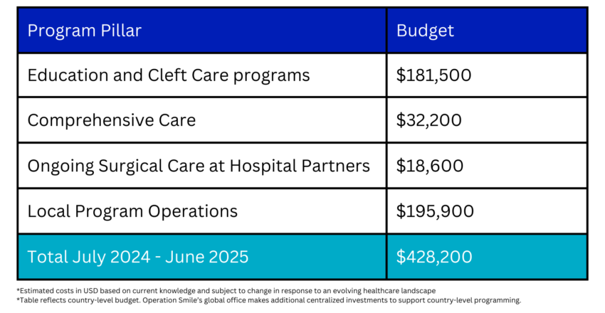 During Fiscal Year July 2024-June 2025, Operation Smile Canada has committed to invest $53,592, accounting for 4% of Jordan’s total projected budget for the fiscal year, which will directly contribute to performing surgery for around 170 patients and providing education and training for approx. 120 medical providers.