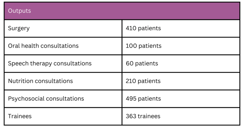 Operation Smile projects to provide surgical care for 410 patients. We will expand our comprehensive cleft care model to provide multidisciplinary services to patients before and after cleft surgery. Operation Smile will deliver consultations in oral health (100 patients), nutrition (210 patients), psychosocial care (~500 patients) and speech therapy (60 patients).