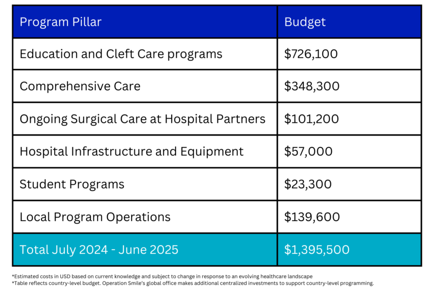 During Fiscal Year July 2024-June 2025, Operation Smile has committed to invest $1.4 million to perform life-changing surgery for 410 patients and provide training for approx. 360 health workers.