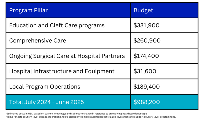 During Fiscal Year July 2024-June 2025, Operation Smile will invest $988,200 to deliver life-changing surgical care for 400 patients and provide training for around 150 health workers.