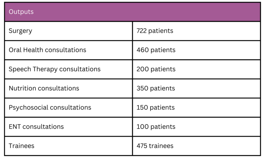 Operation Smile will provide high-quality surgical care for approximately 720 patients. We will expand comprehensive cleft care by delivering consultations in oral health (460 patients), speech therapy (200 patients), nutrition (350 patients), ENT (100 patients) and psychosocial care (150 patients). Operation Smile plans to recruit 300 new patients with the help of partnerships with government agencies and through our system of online registration.