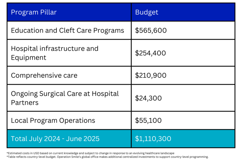 During Fiscal Year July 2024-June 2025, Operation Smile committed to invest $166,002 CAD, accounting for 7% of the country’s budget which will directly contribute to providing top-quality surgery for around 850 patients and train approx. 1,690 medical providers.