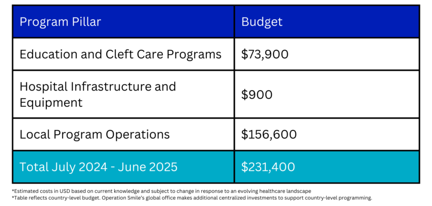 During Fiscal Year July 2024 – June 2025, Operation Smile will invest $231,400 to provide surgical care for over 120 patients and train around 240 medical providers.