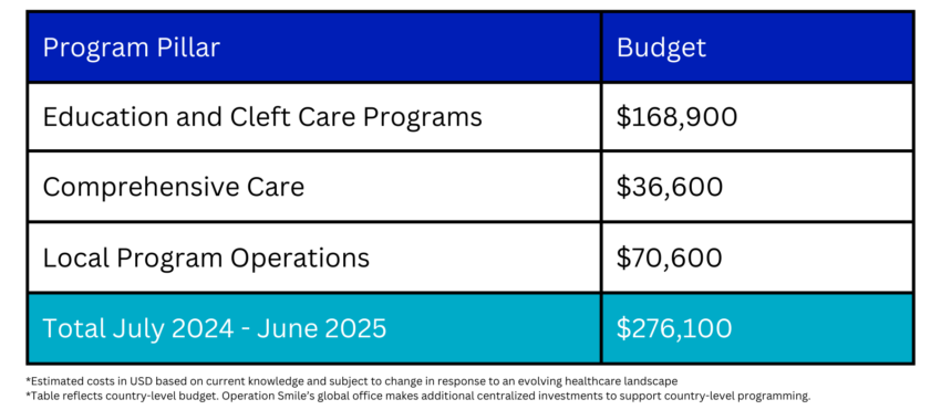 Over the next five years, Operation Smile will provide surgeries for over 1,070 patients. In addition, we will deliver comprehensive cleft care consultations to approx. 2,500 patients.